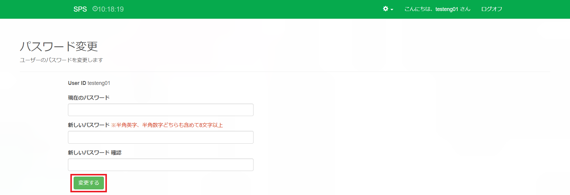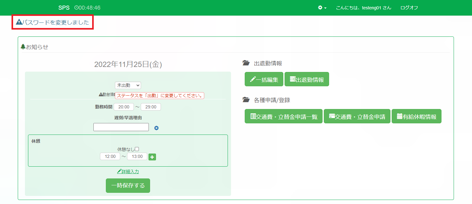 ヘルプページトップ / パスワードを変更する ① メニューより【パスワード変更】をクリックします。 ② 現在のパスワード、新しいパスワードを入力し、【変更する】をクリックします。 ③ パスワードが変更され、左上に「パスワードを変更しました」と表示されます。 Related Articles 7. 見込み時間を登録する 25. 承認担当者グループを作成する 8. 交通費・立替金を承認/却下する 7. 交通費・立替金申請をする 29. 休日を登録する 3. パスワードを変更する